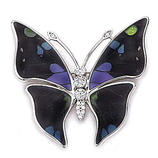 This elegant butterfly brooch is made of sterling silver. It is mounted with many small shimmering stones for a vivid image. The wings of this pretty brooch showcase different colored patches. This nicely designed butterfly brooch is ideal to wear with your formal outfits to spice up your grand look.