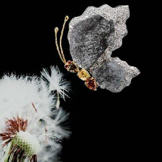 This exquisite brooch lures in your heart with its dancing butterfly themed design. It comes with black diamond slices, white round brilliant-cut diamonds and fancy color diamonds mounted in 18-karat white gold. This sophisticated brooch highlights your look instantly.