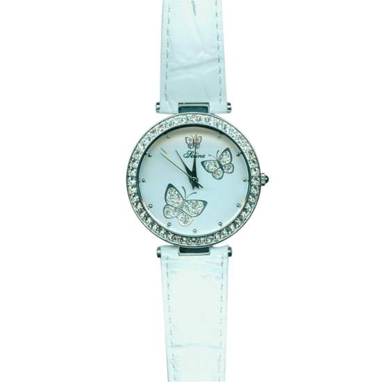 This is a fashion analogue watch with a butterfly design. The watch features crystals decorated around the case and the butterflies. It has a pure white watch dial and strap.
