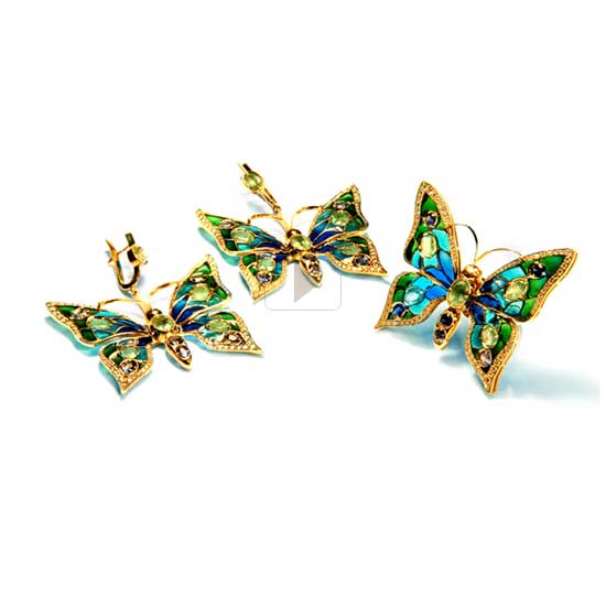 This collection features a pair of earrings and a brooch. Different colors add brightness, complexity, and exoticism to the butterfly jewelry. The gold highlights the sapphire and emerald stones set on the butterfly wings. This delicate butterfly jewelry collection is a great gift for your beloved one.