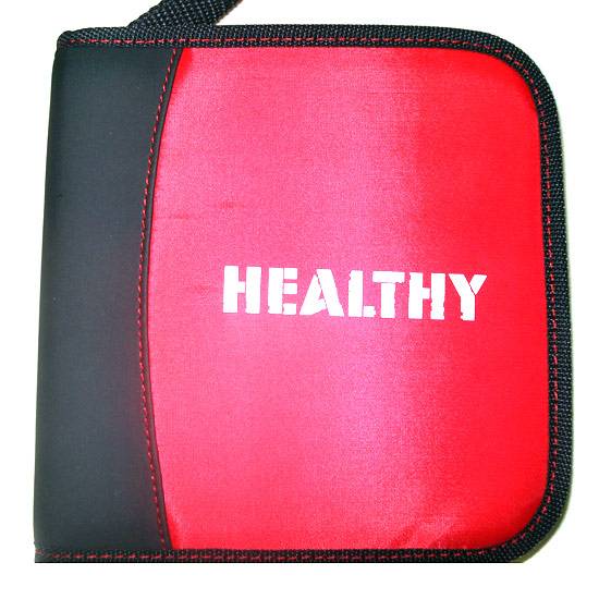 This is a red and black coloured CD bag which is made of nylon. The CD bag is decorated zippered and can be decorated with logos.