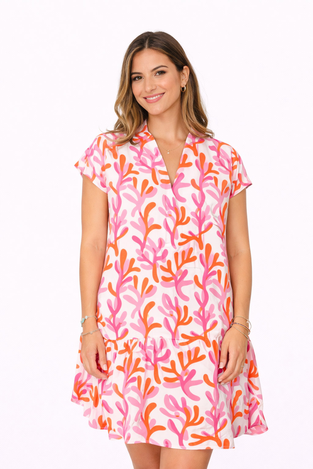 The vibrant coral-inspired print adds a fresh and playful touch, making it perfect for casual outings, vacations, or day events. Crafted from lightweight and breathable fabric, it ensures all-day comfort while keeping you effortlessly stylish. Pair it with flats or heels for a versatile day-to-evening outfit.