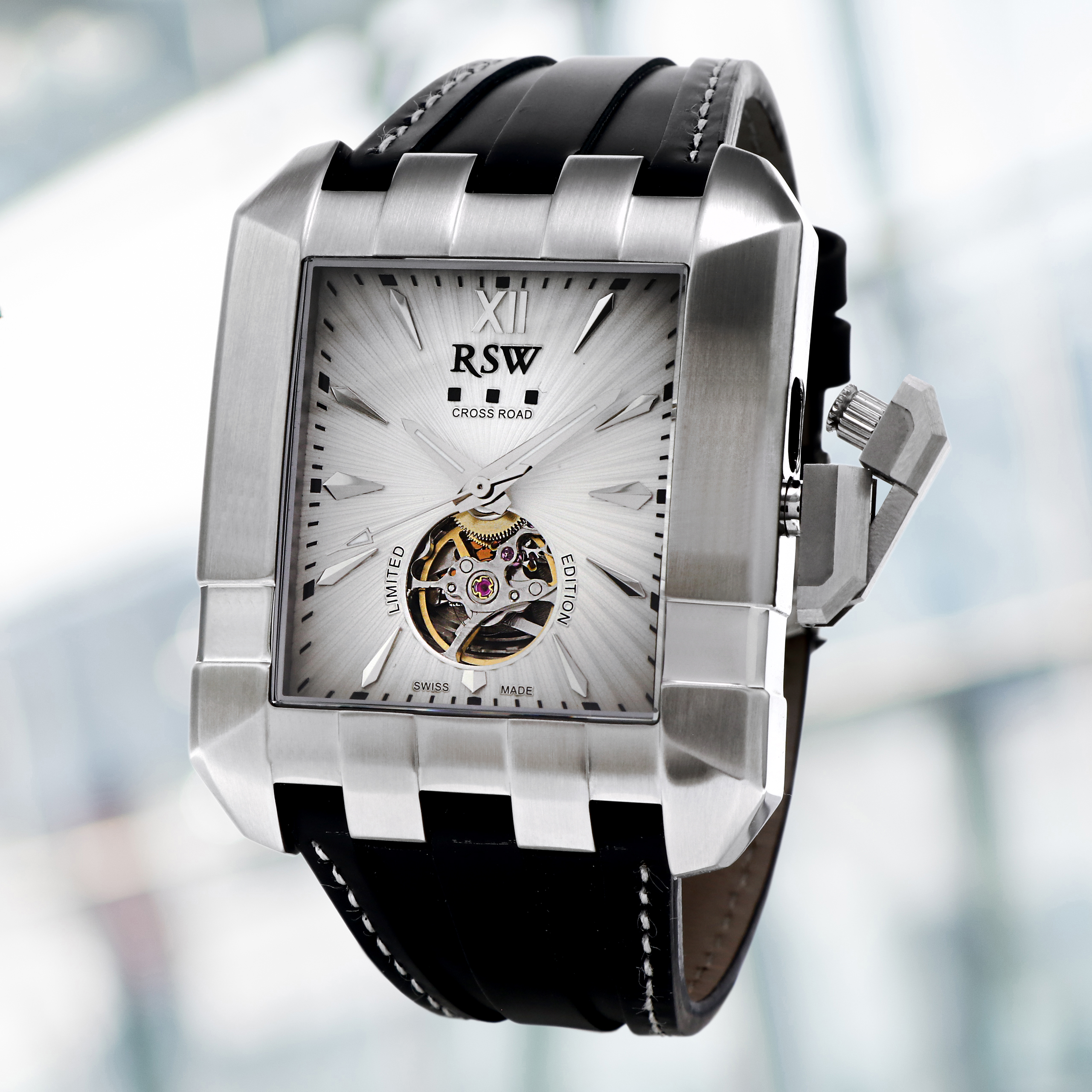 La collection Cross Road se distingue par son imposant boîtier rectangulaire, qui fait forte impression sur le poignet. Cette forme unique n'est pas seulement une question de style ; c'est aussi une célébration de l'horlogerie suisse traditionnelle, réimaginée pour l'homme moderne.