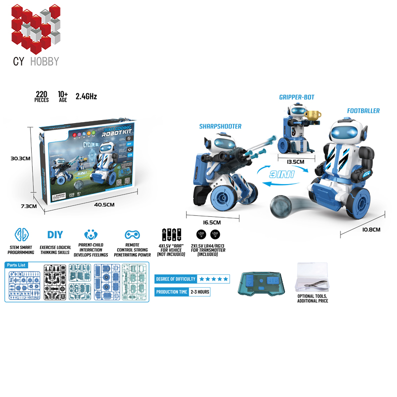 | Self-assembling STEAM toys: 220 accessories It can be transformed into 3 shapes: blocking marksman, football junior, clamping small expert 2.4GHz programming mode Can shoot bullets, set up their own items can be picked up, can play football | |||