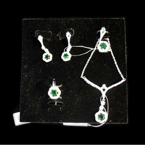 This CZ jewelry set features an elegant design. The pieces of jewelry are fitted with green stones in their centers. Wear this exquisite jewelry set for a more attractive dressing style.