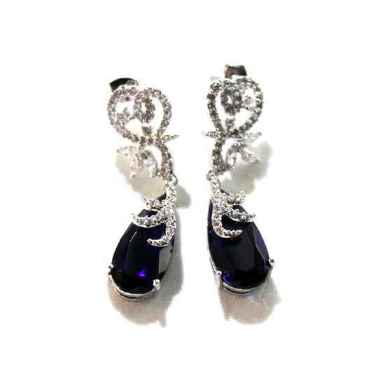 These pretty earrings feature drop-shaped CZ stones in a dark blue color. The micro-pave white CZ stones feature a shimmering swirl design. The alluring CZ stone earrings are secured with butterfly closures.