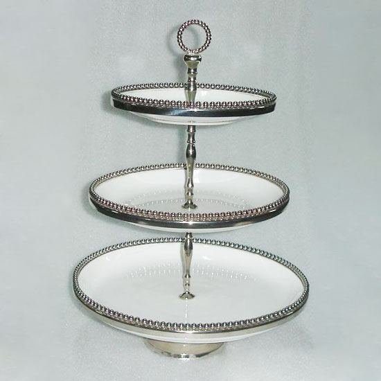 This is a cake tray with three tiers in different sizes. Each tier is designed in pure white with round bead accents. This cake tray adds an elegant sense to your dining table.