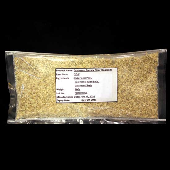 The calamansi dietary fiber is made from the peel of the calamansi fruit. The dietary fiber acts as a health supplement that can be added to different dishes. The fiber is beneficial to the digestive system and can help with constipation.