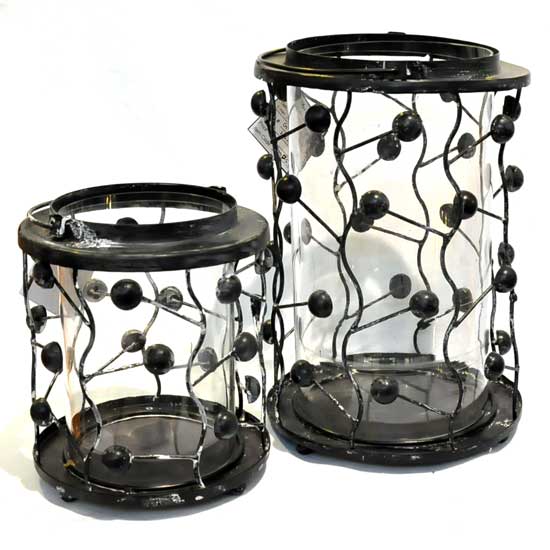 The cylindrical candle holder features a glass shade. The swirling metal wire and ball decorations add an aesthetic touch. Add a romantic ambiance to the room with this decorative metal candle holder.