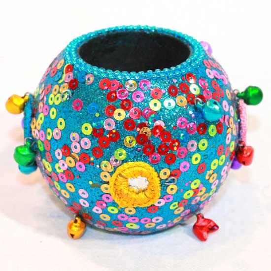 The picture showcases a splendid handmade candle holder in round shape with a glittering surface. The unique candle holder is decorated with colorful sequins and small bells for added attractiveness. This holder will add a touch of exotic flavor to your home decoration.