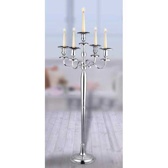The tasteful candle stand is made of rugged metal materials. It features a slender stem and five crooked arms. This piece makes an appealing decoration for households, wedding banquets, etc.