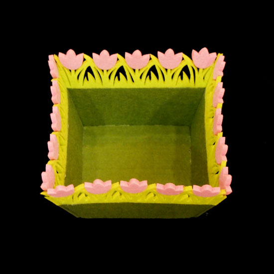 This is a candy container with a floral rim. This felt candy container is soft and collapsible. It is ideal for decorating your dining table.