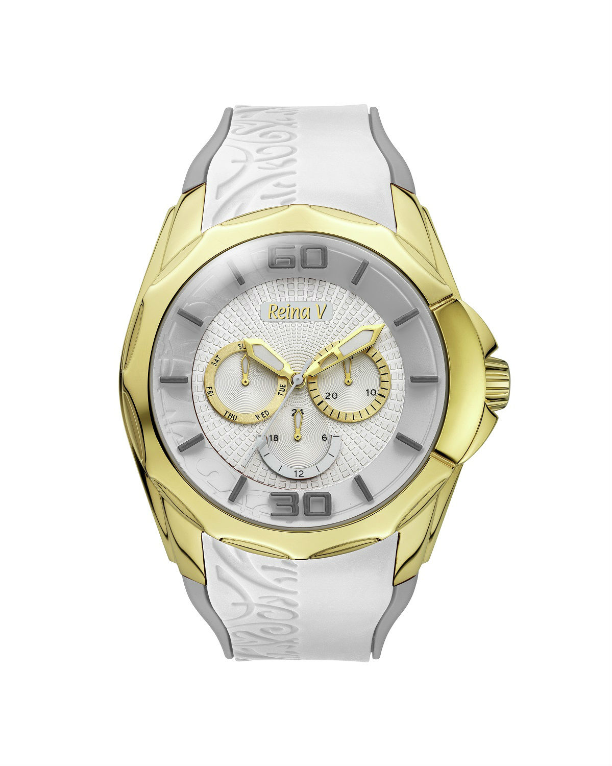 The Candy collection by Reina V. Originally designed elegant fashionable watch with extra soft two tone decorated silicone strap, multi function movement and 3D decorated modern dial. Special ion plated faceted bezel.