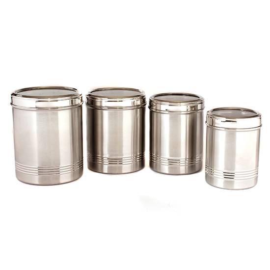 This is a stainless steel conister set with see-through acrylic lid. This cylindrical conister set comes with four pieces containers in different sizes. These containers are perfect to store seasonings, tea, coffee, and other food.