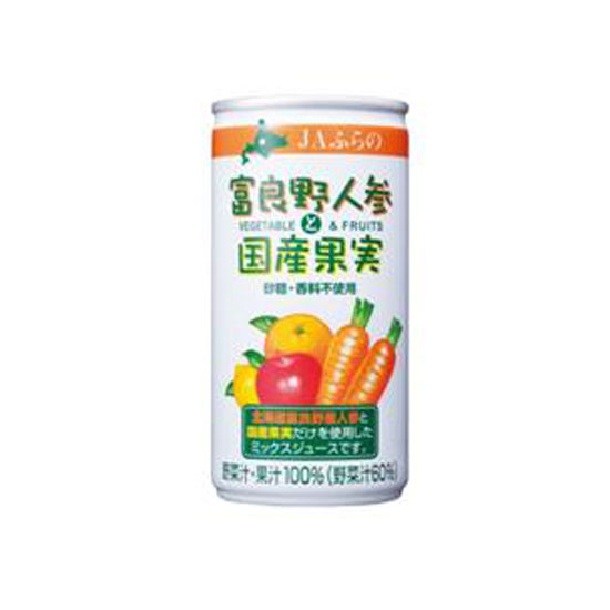Showcased is a canned carrot juice produced with assorted vegetables and fruits. The raw materials are grown in Furano, Hokkaido with high-quality processes. No additive sugar or flavorings are added to ensure a natural taste.