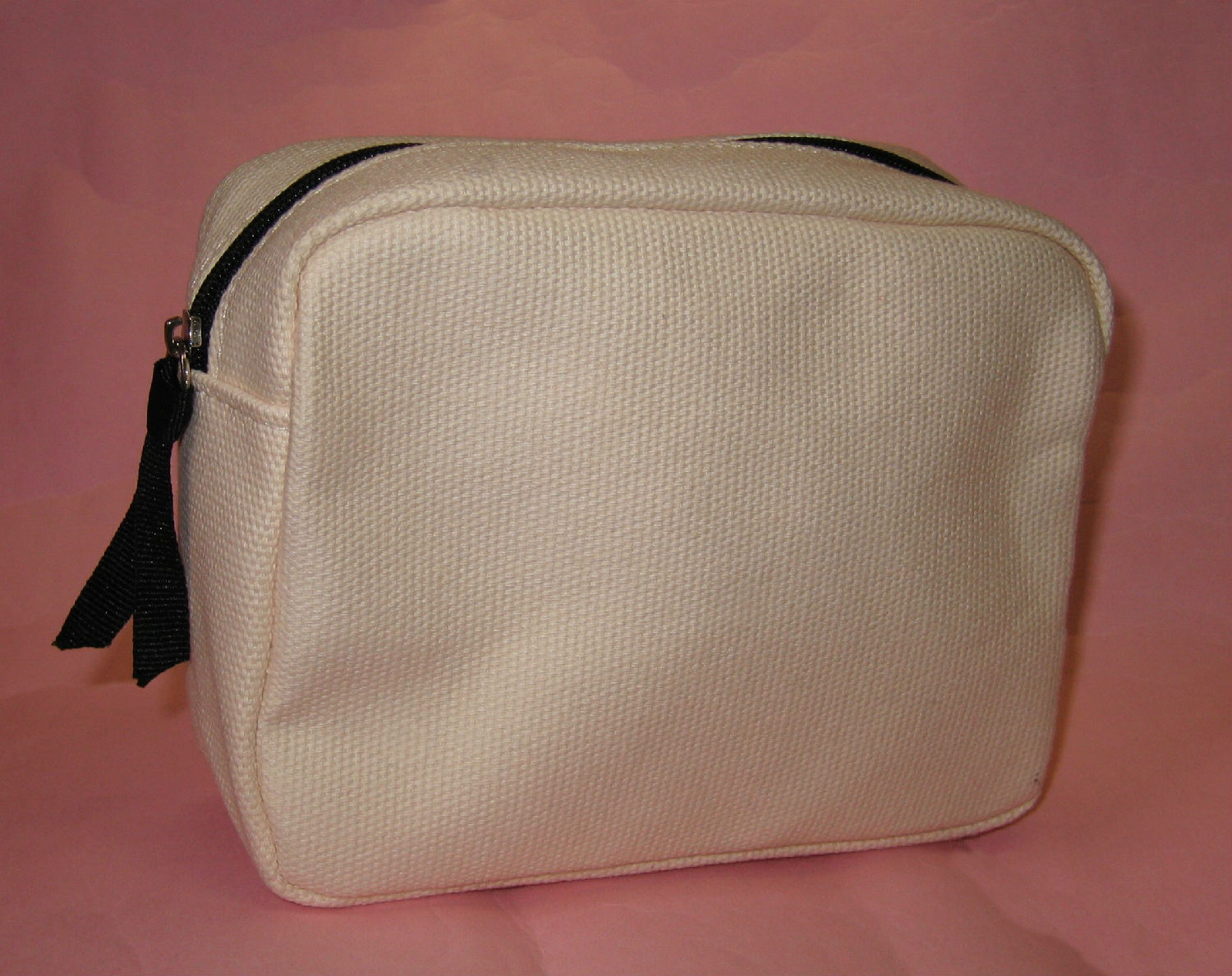 Description: heavy canvas cosmetic bag, with stiff non-woven lining, #3 nylon zipper top closure.