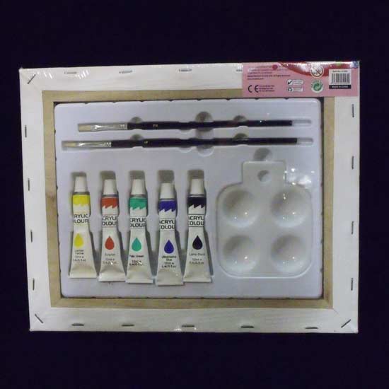This canvas paint set contains a plain canvas, five acrylic paints, one palette and two paintbrushes. This canvas paint set is great for entertaining children during their leisure time. Let children have fun painting the canvas with this canvas paint set.