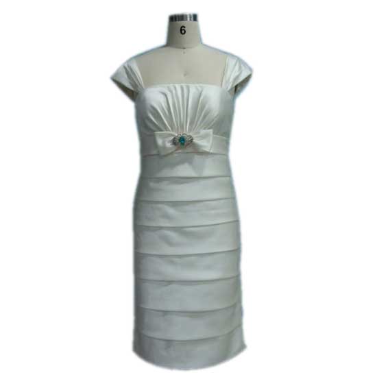 Featured here is an elegant cap sleeve cocktail dress in white. Gathered pleats in the front and a bow adornment adorn this dress in the center. A tasteful striped pencil skirt finishes this dress.