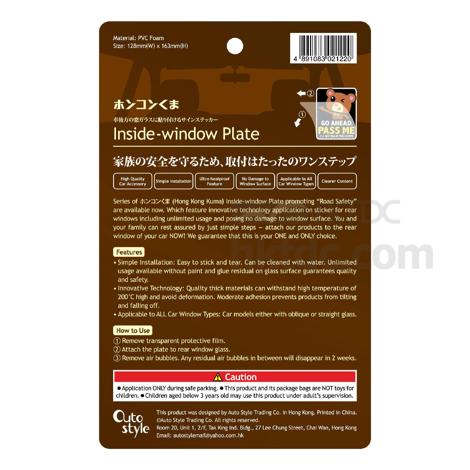 Series of ホンコンくま (Hong Kong Kuma) Inside-window Plate promoting “Road Safety” are available now. Which feature innovative technology application on sticker for rear windows including unlimited usage and posing no damage to window surface. You and your family can rest assured by just simple steps – attach our products to the rear window of your car NOW! We guarantee that this is your ONE and ONLY choice.