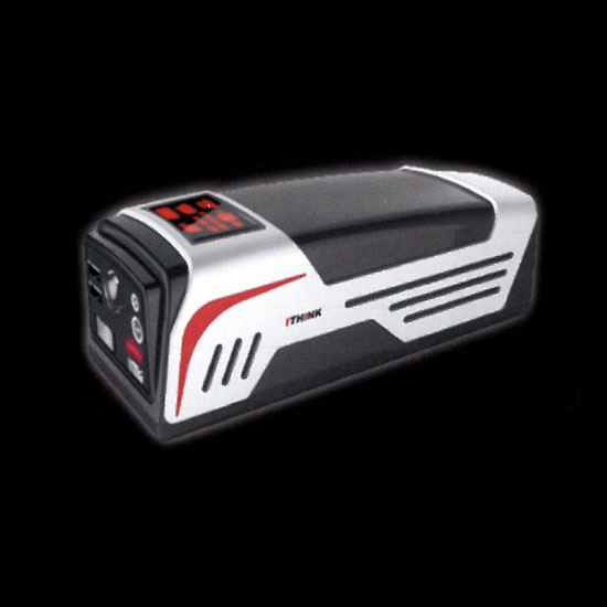 This car jump starter boasts a modern and streamlined design. It features a black housing with color accents. This jump starter is suitable for various kinds of vehicles.