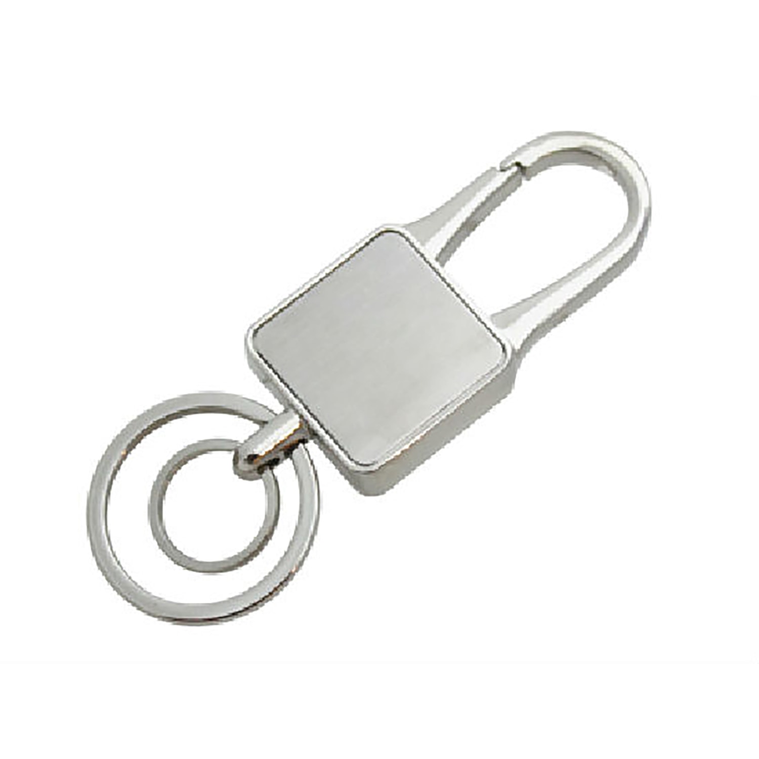 Square-shaped metal keychain with carabiner hook includes the following features: