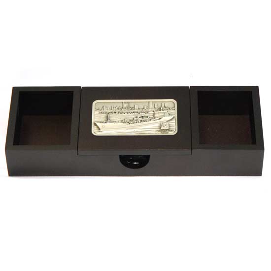 This name card holder is made of quality dark-brown wood to exude a sense of luxury. A burnished metal plate is crafted with a beautiful boat pattern. The holder comes with 3 compartments for stationery items.