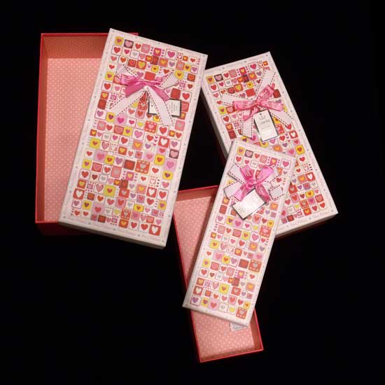 The cardboard box showcases adorable heart patterns all over. The quality cardboard construction gives lasting durability. This romantic cardboard box offers a wonderful gift-packaging solution.