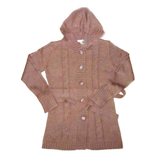 This is a long knitted cardigan with a belt and a hat attached. The cardigan is relatively thin but has binded sleeves for keeping warmth better.