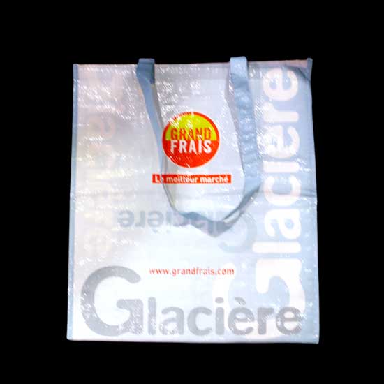 This carrying bag in pale blue is constructed from plastic for a long service time. It comes with elegant letters on it for advertising use. This sturdy carrying bag with a glossy finish is great as a shopping bag.