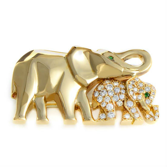 • This expertly crafted brooch from Cartier is lavish and lovely. The brooch is made of solid 18K yellow gold and depicts a mother elephant and her baby. The young elephant is set with an ~.50ct diamond pave, and each elephant has an eye made of emerald.