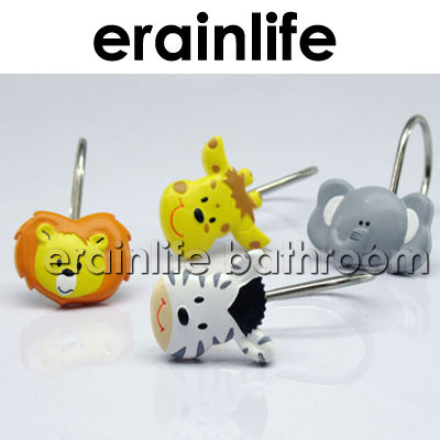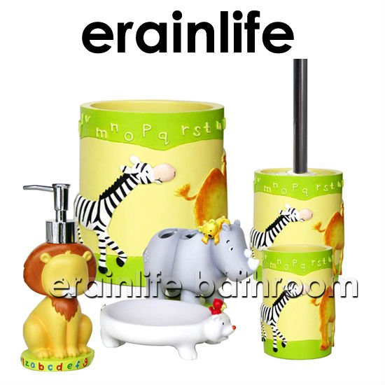 The items of this bathroom set are embellished with engaging hand-painted animal patterns.