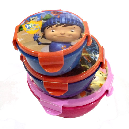 This round cartoon lunch box attracts children with brightly colored graphics. It features four safety locks on the sides for secure closure. Designs in any color and sizes can be produced as per your request.