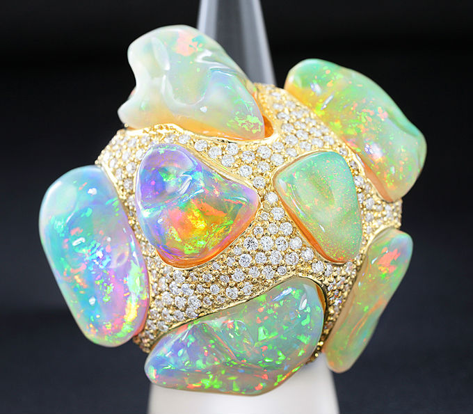 One of a kind 18k solid yellow gold ring set with carved 61.75 ct fire opals and 3.23 ct natural diamonds.