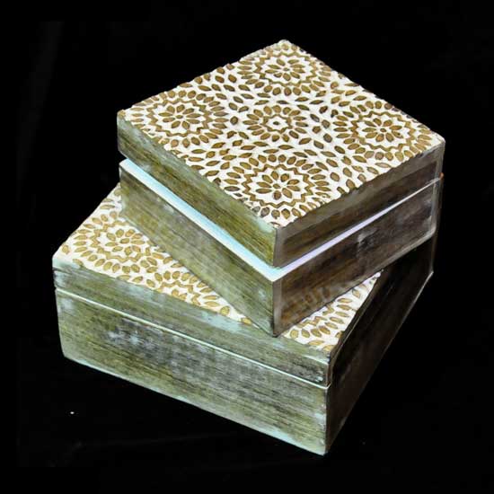 Featured is a wooden box with a hand-carved lid depicting delicate flower patterns with an ethnic touch. The natural wood grain on the body is unique and genuine. Keep your treasure in this carved wooden jewelry box.