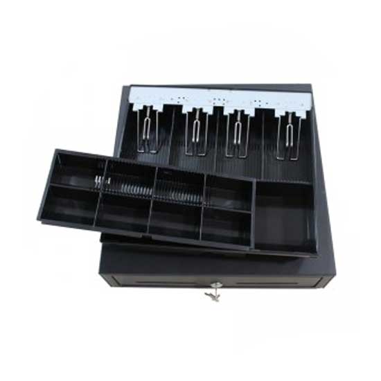 This is a cash drawer with a black finish. Made of SPCC cold rolling steel, this cash drawer boasts a long service life. Organize the cash and coins for your business with this cash drawer.