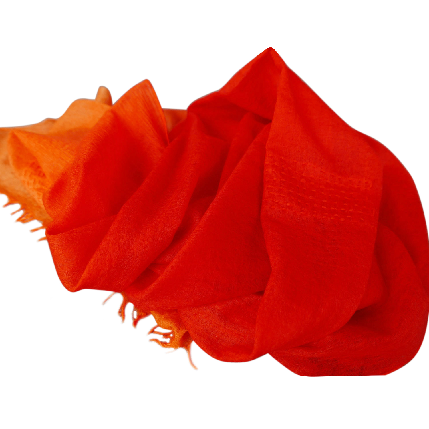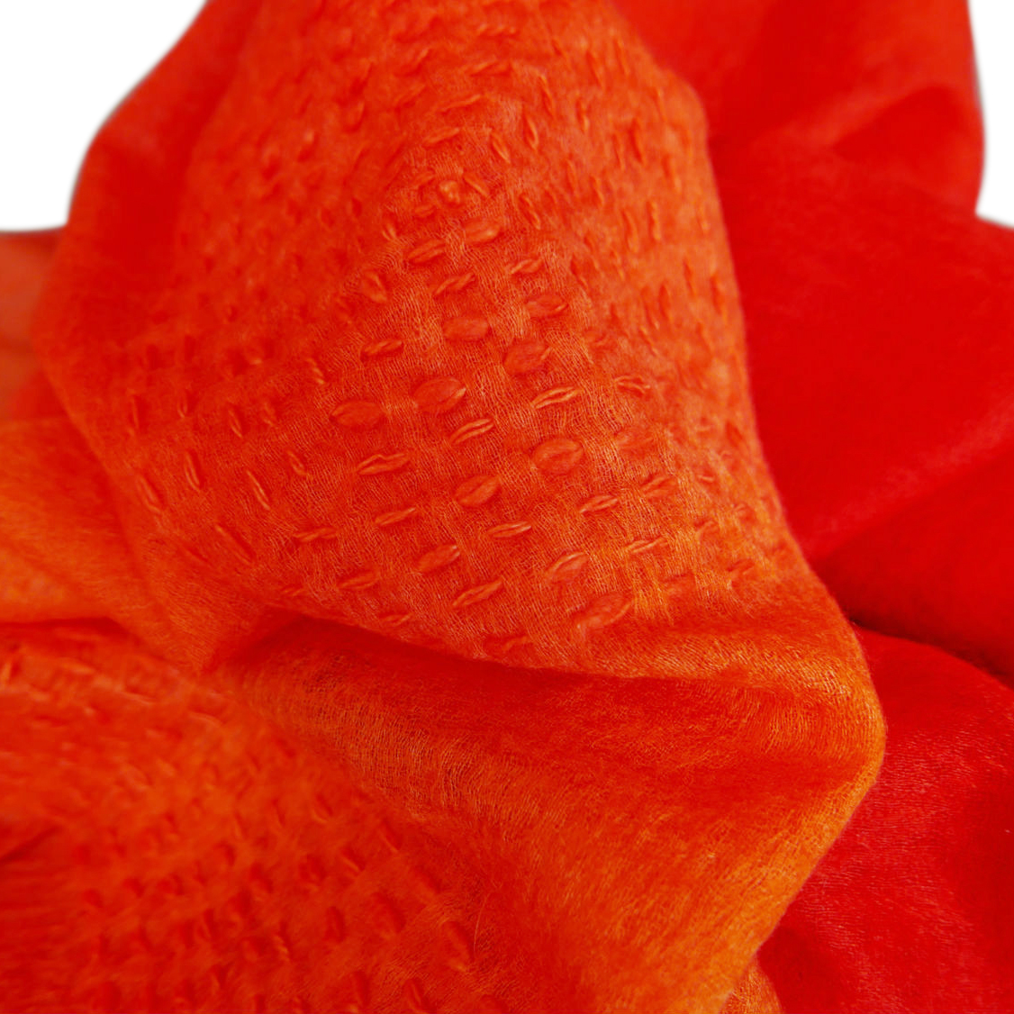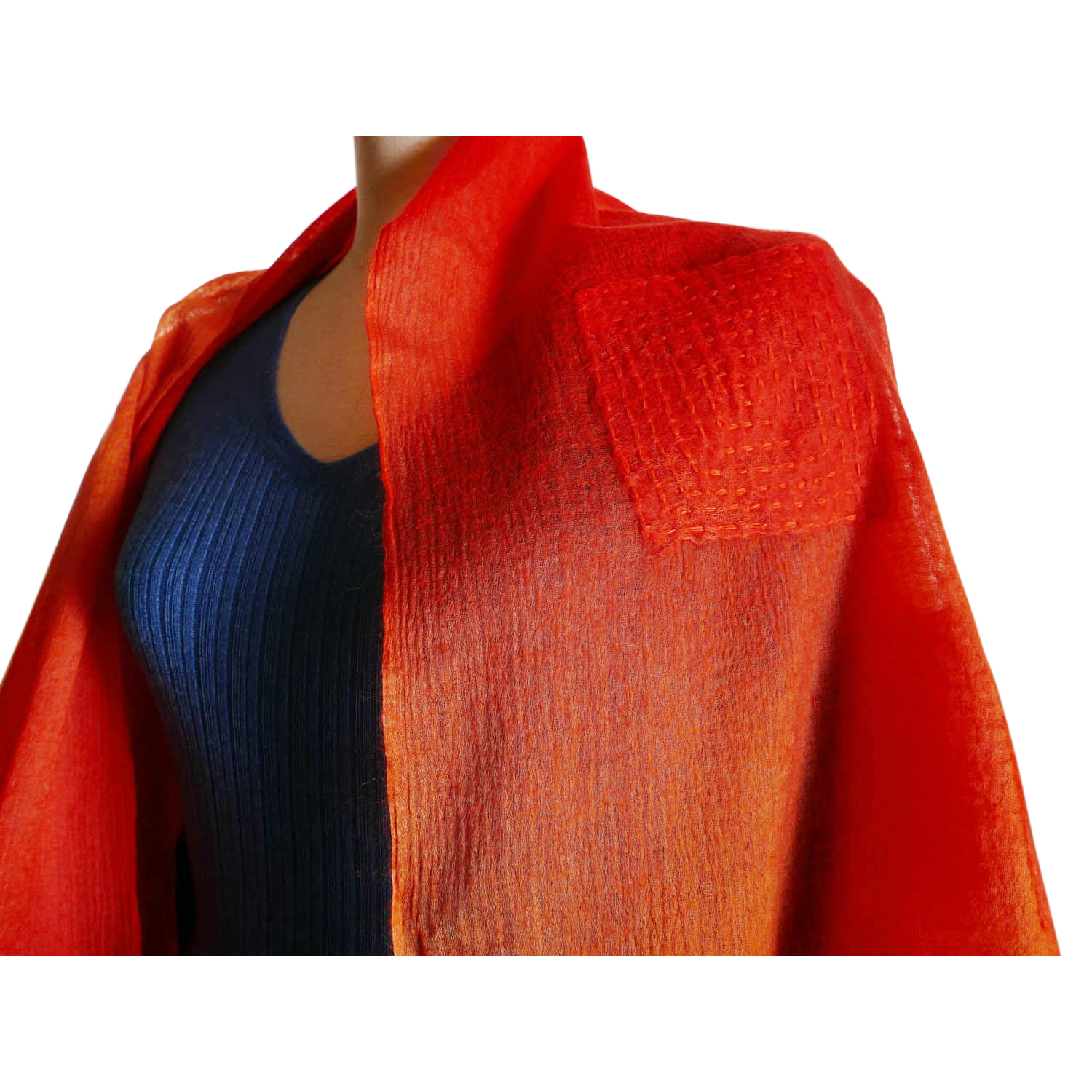 appliqué with cashmere thread with single needle stitches. Ombre dyed in tomato red and orange.