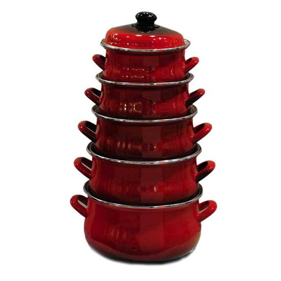 Featured here is a five-piece enamel casserole set in gradient sizes. The contemporary casseroles feature sleek enamel bodies in glossy red finish. The casseroles are fitted with ear-shaped handles for ease of use.
