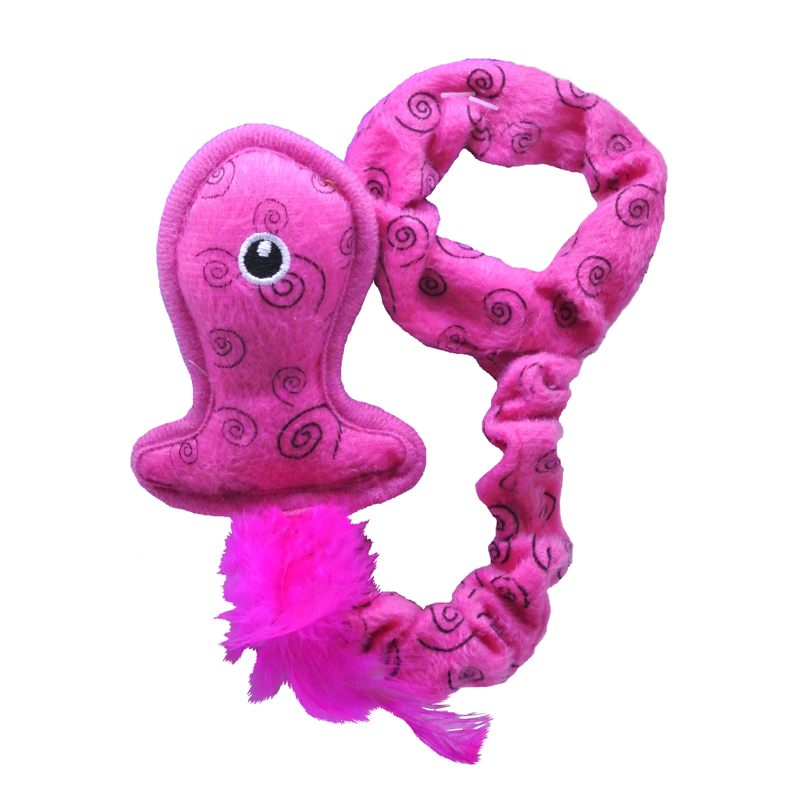 Let your curious cat dive into deep-sea playtime with the Twisty Tentacle Buddy! Available in vibrant blue, pink, and purple, this whimsical sea-creature-inspired toy features a single googly eye, a twisty plush body, and a fluttery feather tail—perfect for batting, chasing, and chewing.