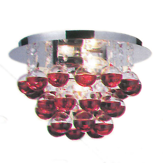 This ceiling light features a round panel with hanging spherical adornments. This light comes with an amusing design with red transparent decorations. This round ceiling light is suitable for commercial and residential use.