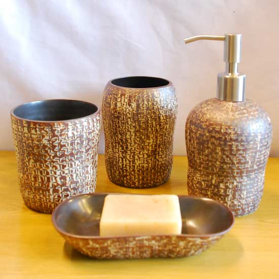 Featured here is a bathroom set with an exquisite design. It comes with a liquid dispenser, a soap holder and two cups, in a special curvy shape. The ceramic surface is painted with unique mottles that exhibit a rustic style.