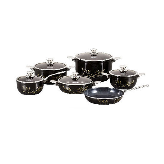 This "Jasmine" cookware set comes with a black finish. The cookware can be used on an induction stove for efficient heating. The cookware is equipped with well designed knobs and handles for convenient use.