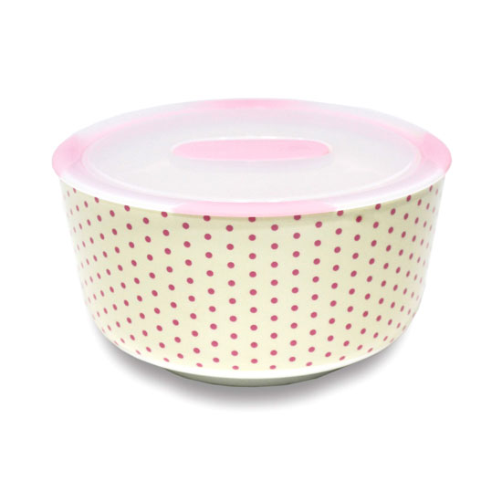 This is a ceramic food container that is accented with allover dot patterns. It is fitted with an airtight cover. This quality food container offers an extra-long service life.