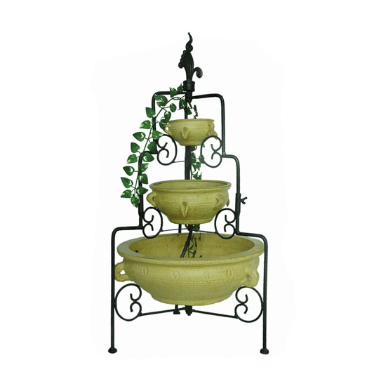 As shown is a ceramic fountain with a three-tiered design. This piece is also enriched by a nice swirly stand. This fountain calms your soul with its beauty and soothing water sounds.