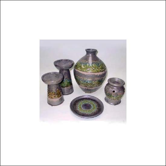 A ceramic houseware set includes pillar holders, a vase, a pillar plate, and a burner