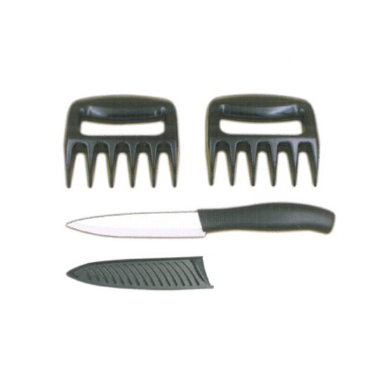 This is a knife set with two meat tools, a slicing knife and a knife sheath. It is made of quality ceramic for a long service life. This ceramic knife set is an ideal addition to your modern kitchen.
