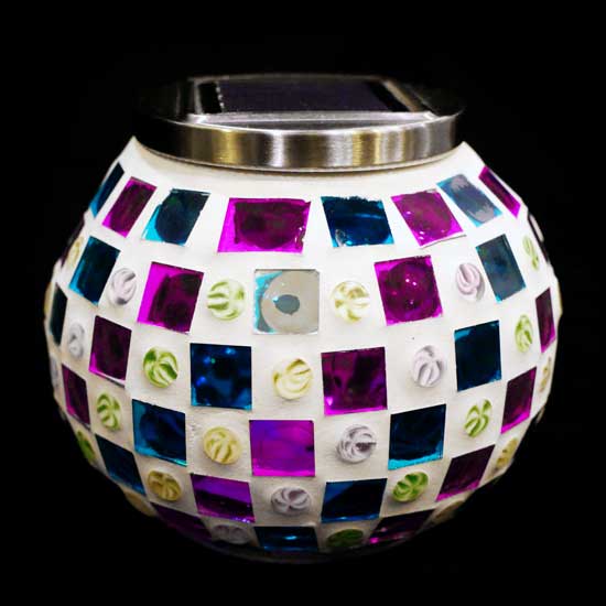 This ceramic solar lantern grabs people's attention instantly with its colorful and beautiful housing. Its housing is made of ceramic and adorned with assorted elements. The LED light source lowers energy costs and has a long service life.
