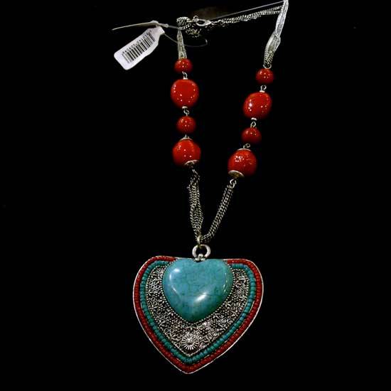 This necklace boasts an exotic style with its colored beads and ceramic decorations. The heart-shaped pendant is framed with the embossed silvery and beaded setting. This delicate necklace is a fashionable item for ladies.