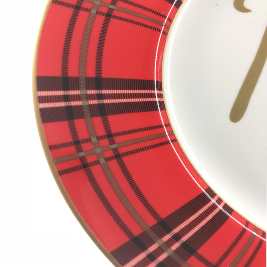 Serve the holiday appetizers with the blessing and in a classy style using this Christmas plate. This ceramic plate showcases a traditional Christmas design of tartan grid popping in bright colors and a solid center with the words of “peace and joy”. It makes a nice gifting choice for your family and friends too