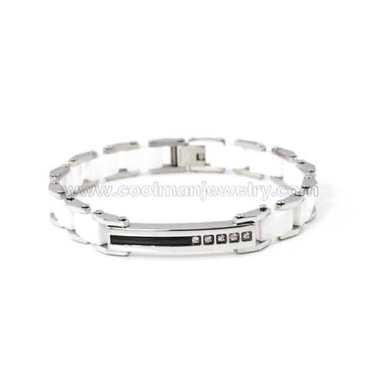 This is a costume bracelet that is finely made of ceramic and stainless steel. It is accented with shimmering CZ stones for added elegance. This costume bracelet fits comfortably on your wrist.