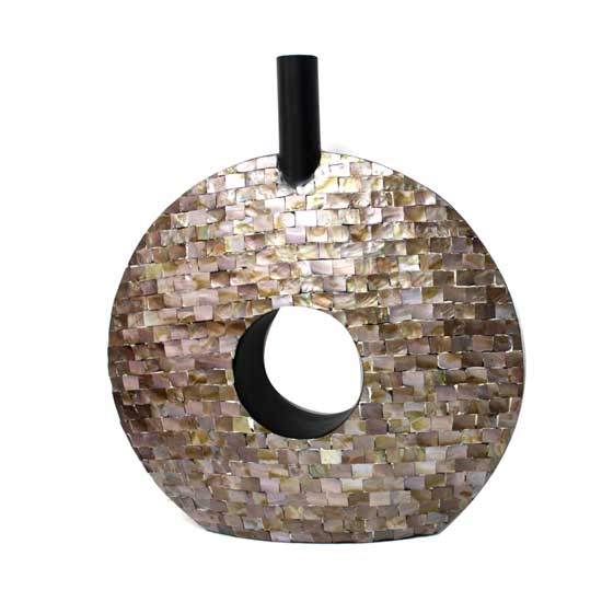 The featured vase is designed in a ring shape to express a contemporary style. The surface is paved with natural mother-of-pearl for a mosaic effect. The natural colors go well with any types of flowers or plants.